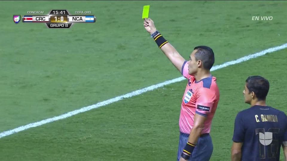 Tarjeta amarilla. El árbitro amonesta a Kendall Waston de Costa Rica