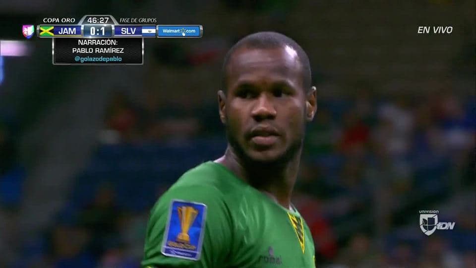 Tarjeta amarilla. El árbitro amonesta a Romario Williams de Jamaica