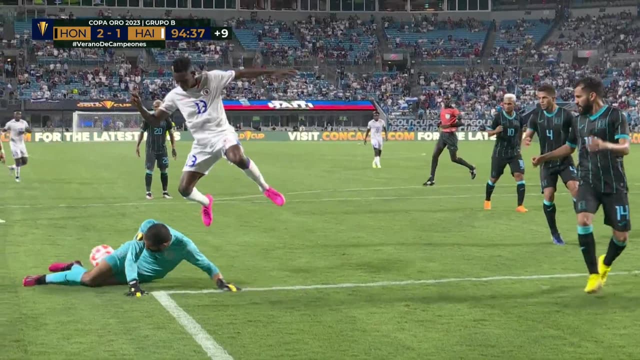 Tiro atajado. Jayro Jean (Haití) Disparo con la derecha desde el lado derecho dentro del área.