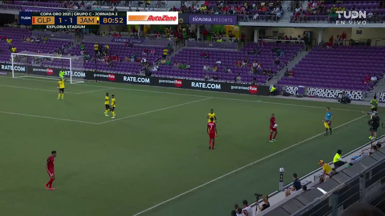 Tiro atajado raso al centro del arco. Vikash Tillé (Guadalupe) zurdazo desde fuera del área. Asistencia de Morgan Saint-Maximin.