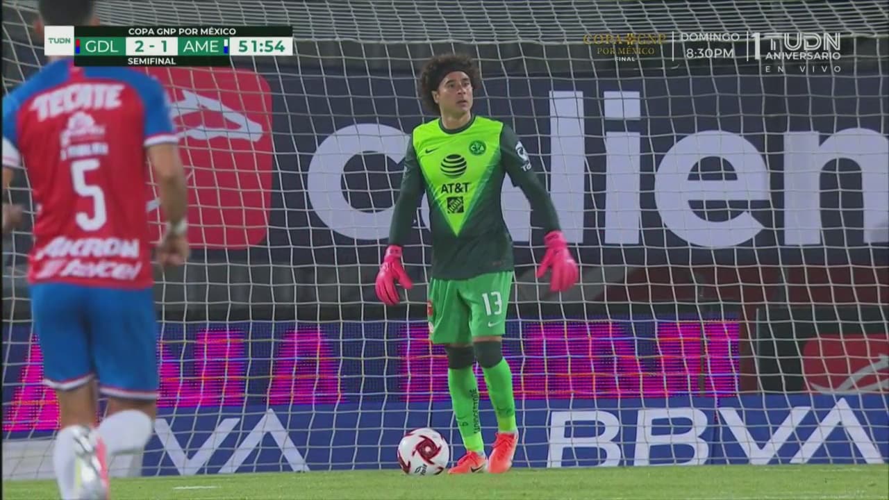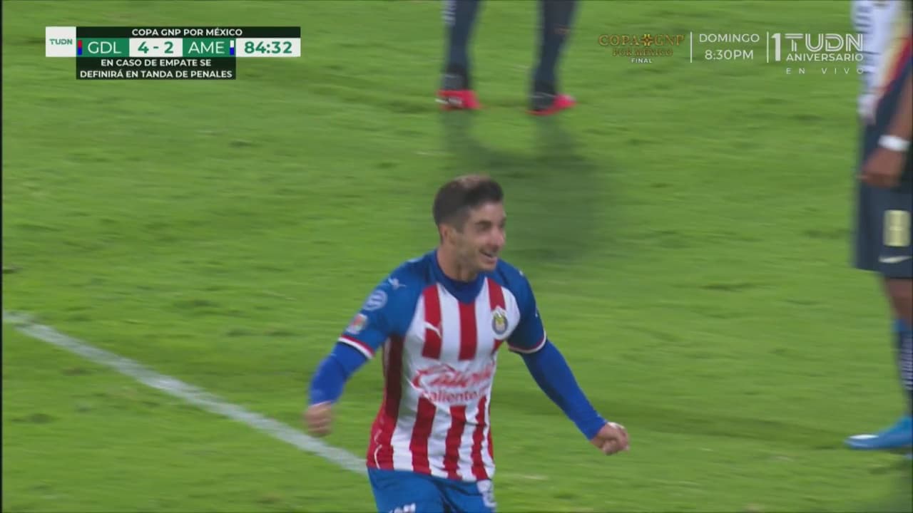 El Guadalajara no cesó en su afán de hacer pedazos al América y tejieron una jugada digna de grandes equipos, cuando un trazo a la banda llegó a los pies de Angulo, proyectó el balón al área para que Vega y José Juan Macías hicieran una pared perfecta que Alexis terminó con disparo potente al ángulo. El Rebaño jugaba por nota.