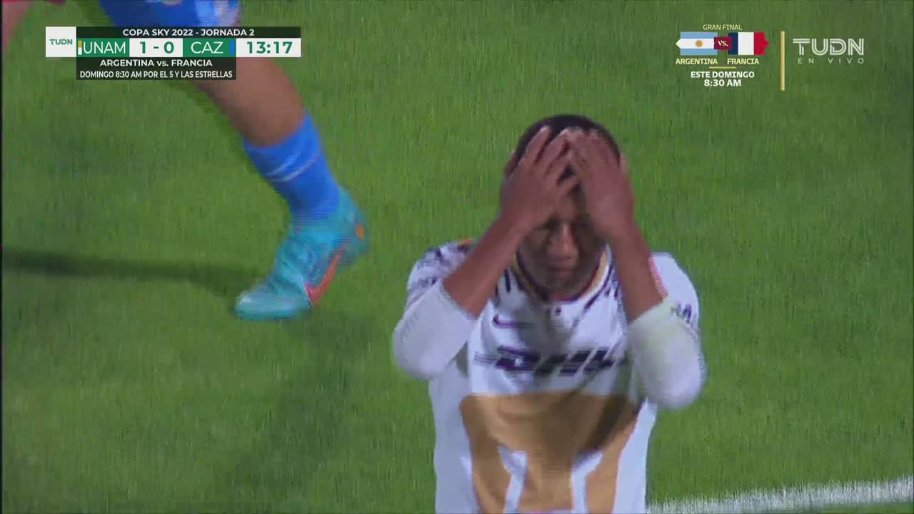 Al 57', Gil Alcalá, arquero de Pumas equivoca su despeje en el área mismo que capturó el delantero celeste Carlos Rotondi.