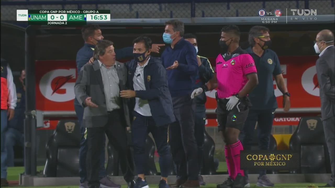 No habían pasado ni 20 minutos cuando ya había un conato de bronca en las bancas. Y es que Miguel Herrera discutió una jugada y a Míchel González no le pareció, cruzaron palabras airadamente y hasta Enrique Sanz, del cuerpo técnico universitario, se enfrentó al Piojo que se fue de frente hasta que Israel López lo contuvo y lo regresó a su banca..