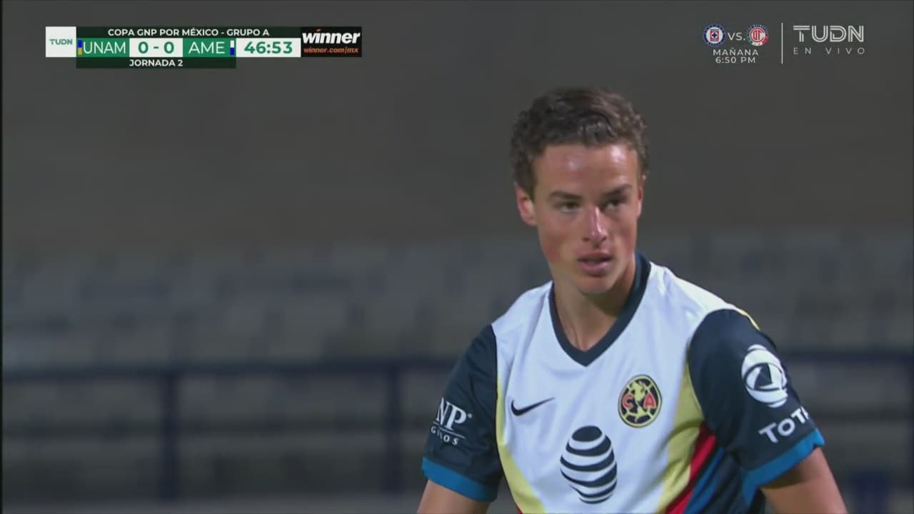 América quiso reaccionar con una buena diagonal de Paul Aguilar pero la defensa de Pumas evitó que Martínez rematara a puerta cortando oportunamente.