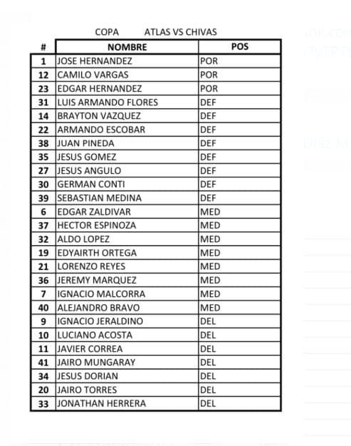 Quienes sí están son Edyairth Ortega, Ignacio Malcorra y Armando Escobar. Atlas se mide este sábado al Rebaño, que el viernes dio a conocer su plantel y tiene la baja de tres elementos por lesión; Ángel Zaldívar, Cristian Calderón y Uriel Antuna.