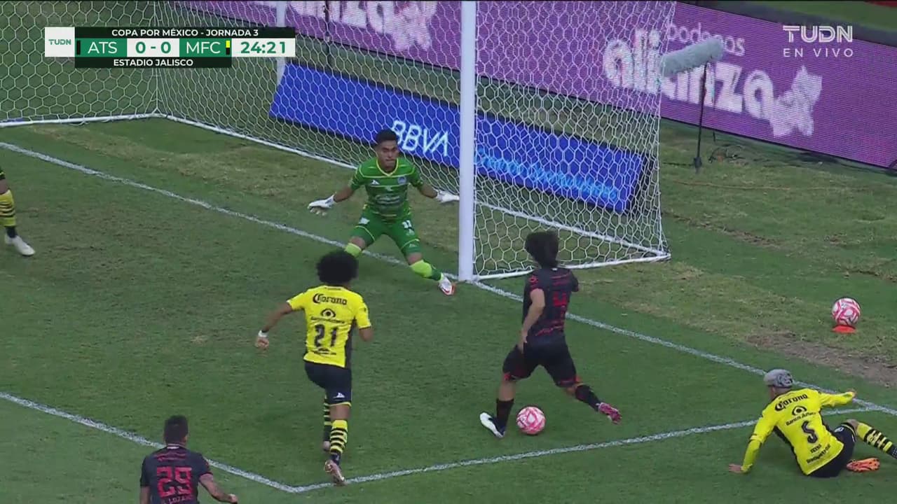 El zaguero rojinegro se quita la presión con lujos y mete el centro que no mandan a la red.