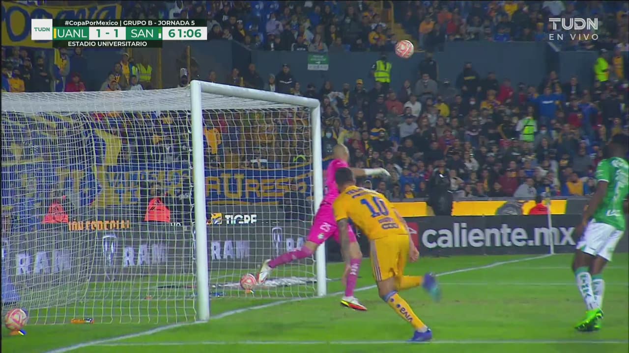 Buen centro por derecha que el delantero de Tigres cabecea, pero por un costado de la portería al 61'.