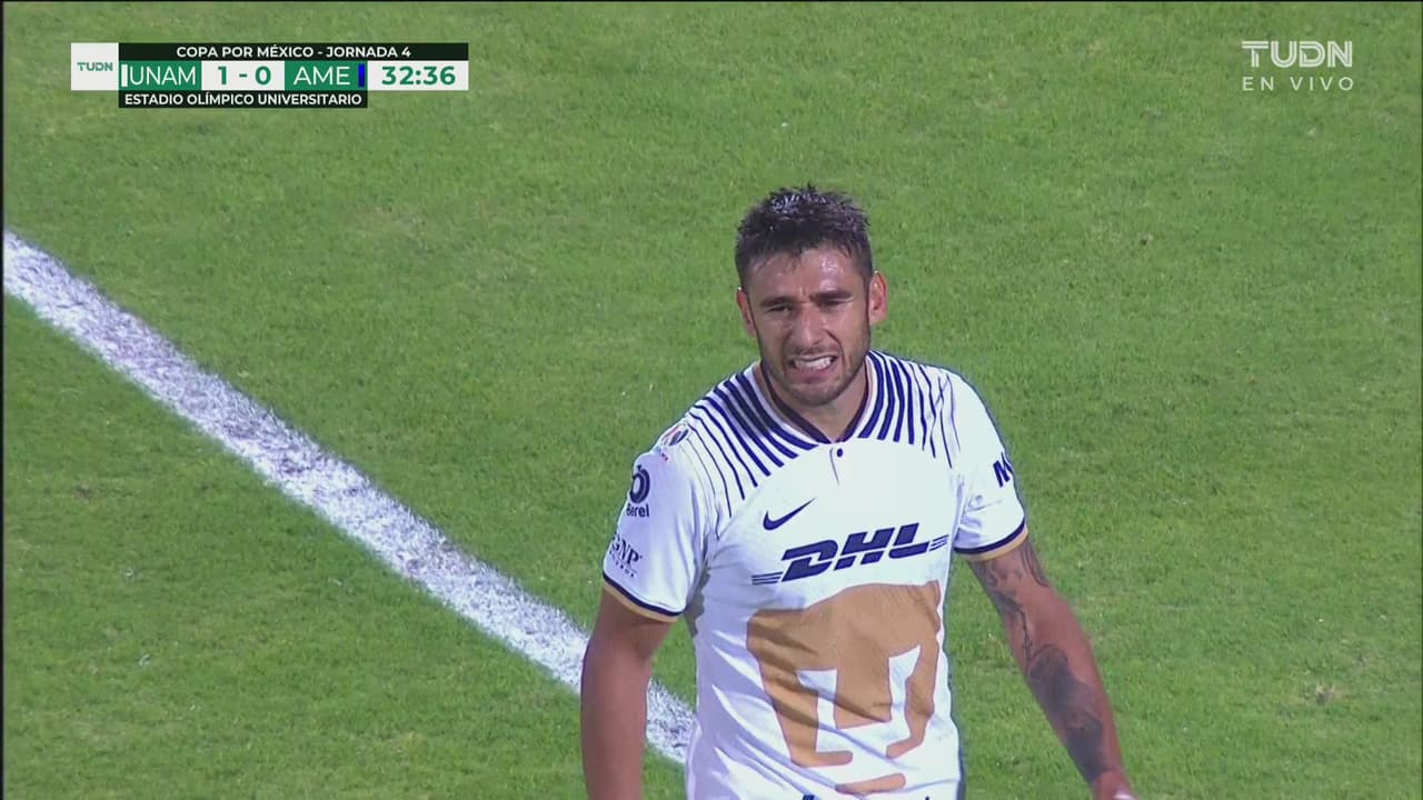 El jugador de Pumas tuvo el segundo, le pega con furia y la manda a la tribuna, al minuto 33.