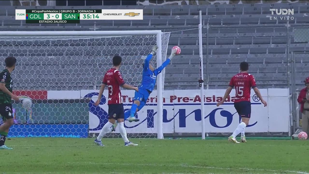 Santos intenta reaccionar con un remata de Harold dentro del área, pero el portero salva a Chivas al 35’.