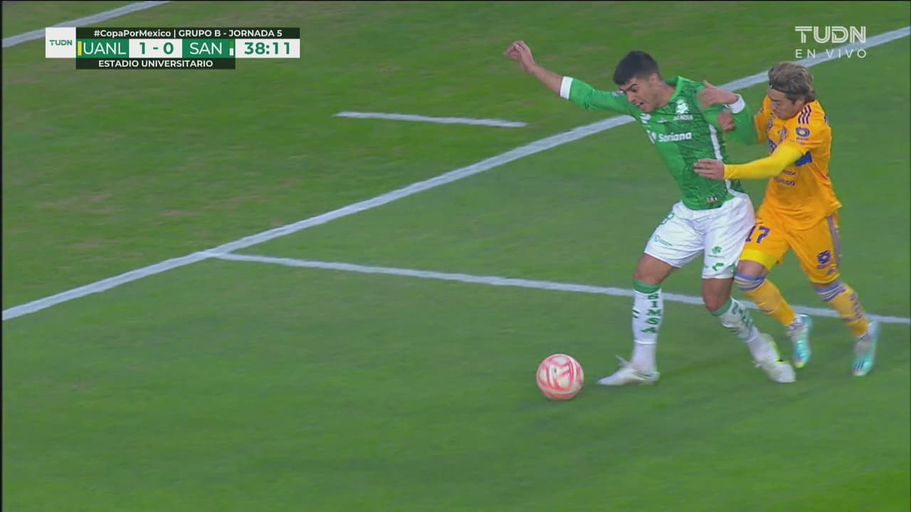El jugador de Santos va al césped y el silbante no decide marcar la pena máxima, al minuto 38.