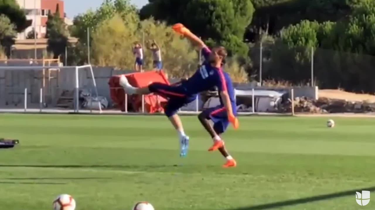 El arquero del Atlético de Madrid marcó una autentica joya en el entrenamiento, muy similar a la de Cristiano Ronaldo en Champions League.