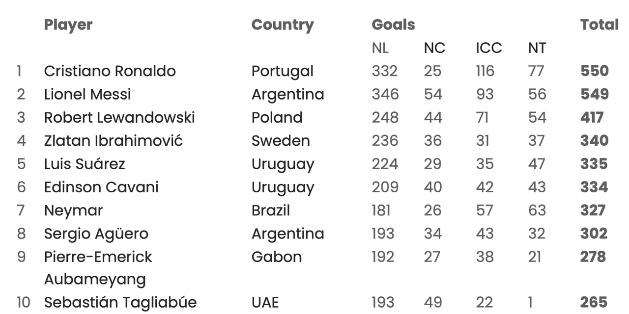 Se consideran todos los goles en Liga, Copa, partidos internacionales con sus respectivos clubes y participación con selección nacional. El 'Top 10' de este listado queda de la siguiente manera: