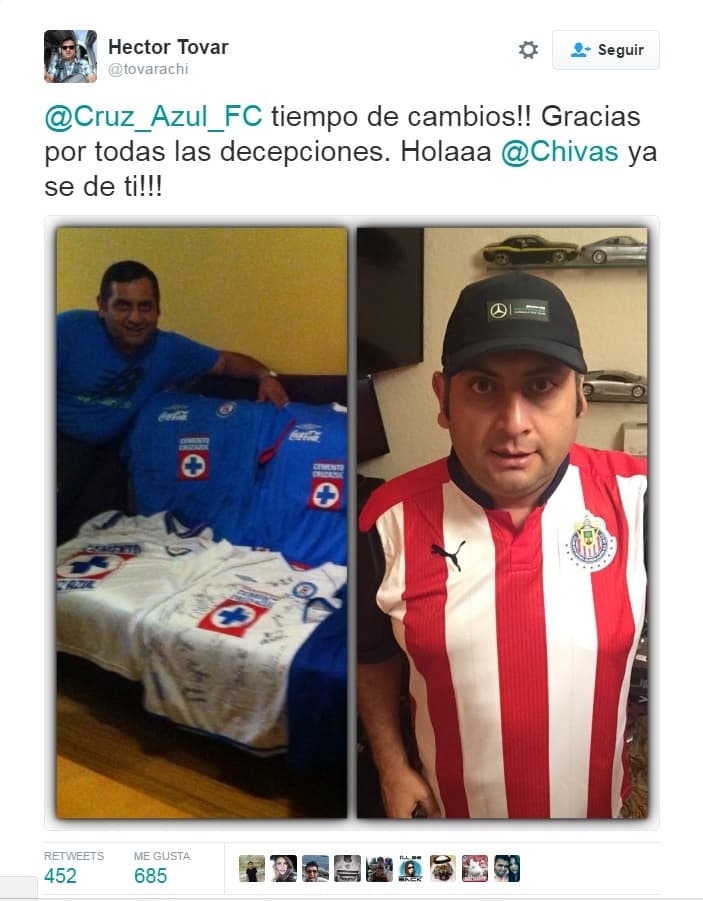 Un aficionado ha levantado polémica en redes sociales por su decisión de cambiar de equipo al abandonar su fanatismo por el Cruz Azul para convertirse en seguidor de las Chivas. Héctor Tovar, con usuario en Twitter como @tovarachi, publicó una fotografía en la que se le aprecia portando la playera del Rebaño, por lo que las críticas en las redes sociales no se han hecho esperar.