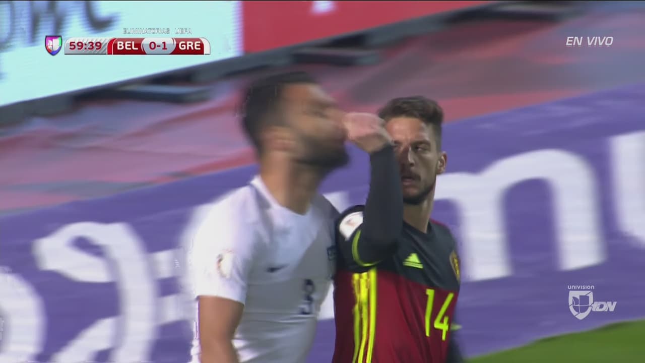 El delantero de la selección de Bélgica agredió de forma vulgar a Georgios Tzavelas con dos jalones de nariz tras un roce entre los futbolistas cuando buscaban el balón dentro del área.