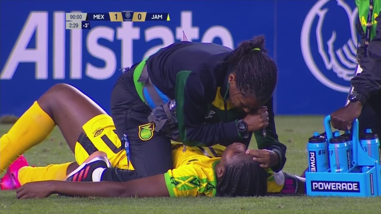 ¡Duro choque de cabezas entre jugadoras del Tri y Jamaica!