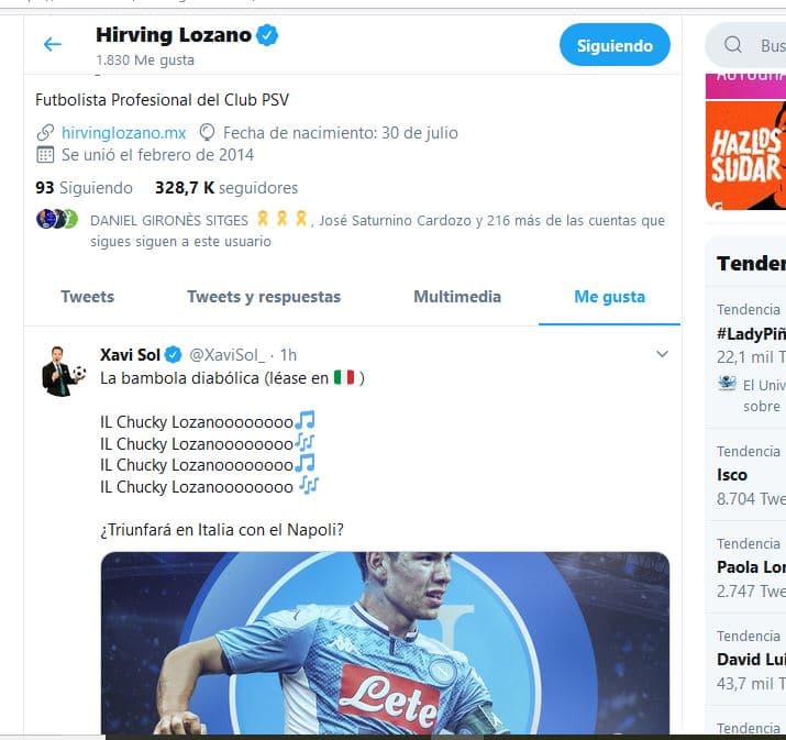 Los rumores sobre la posible llegada de Hirving Lozano al SSC Napoli cobran fuerza, luego de que el mexicano diera like a una publicación de Xavi Sol, conductor de TUDN, que ameniza en un tuit la llegada del aún jugador del PSV Eindhoven al Calcio con el cántico que le caracterizó durante el Mundial de Rusia 2018.