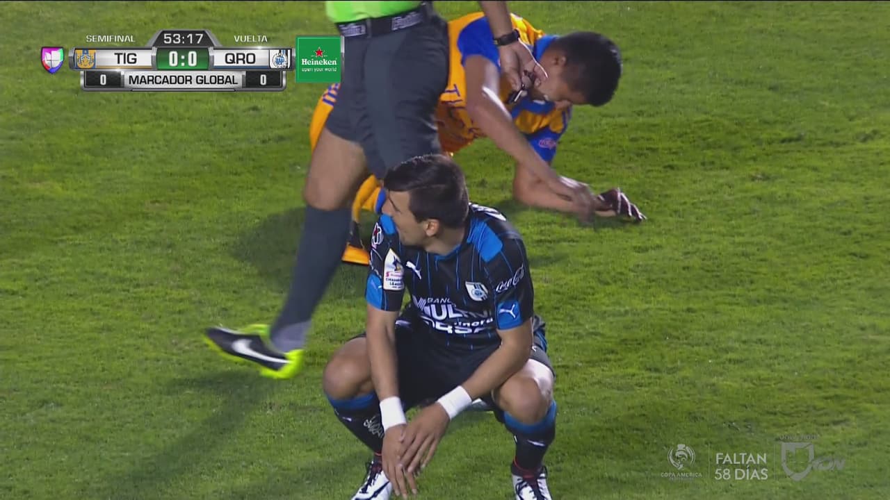 El delantero de Gallos saca disparo franco entre dos Tigres, pero el balón pega en uno de los postes del arco de Nahuel Guzmán.
