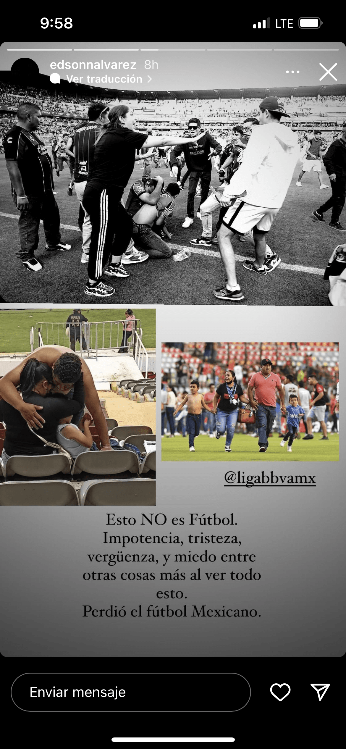 “Esto no es futbol. Impotencia, tristeza, Vergüenza y miedo, entre otras cosas más al ver todo esto. Perdió el futbol mexicano”, dice su primer post en Instagram, el cual muestra imágenes de la bronca en el estadio.