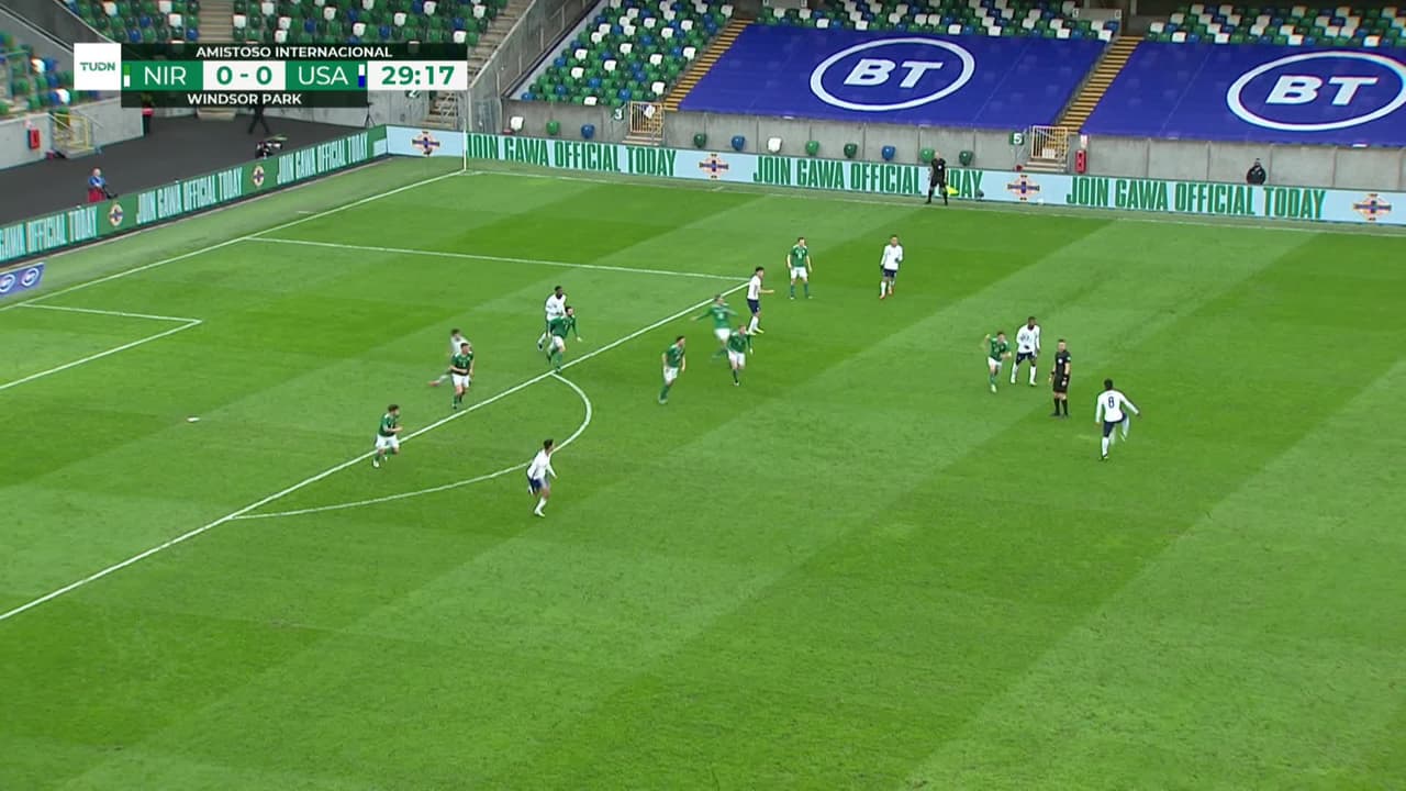 ¡Gol! Irlanda del Norte 0| Estados Unidos (Selección de futbol) 1. Giovanni Reyna (Estados Unidos (Selección de futbol)) Disparo con la derecha desde fuera del área por el centro del arco. Asistencia de Tim Ream.