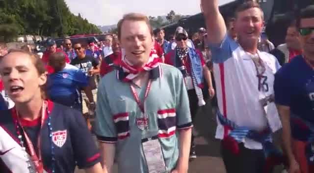 Ingresando al Estadio Azteca, los seguidores del equipo de Bruce Arena entonan cánticos en español mientras los mexicanos intentan acallarlos.