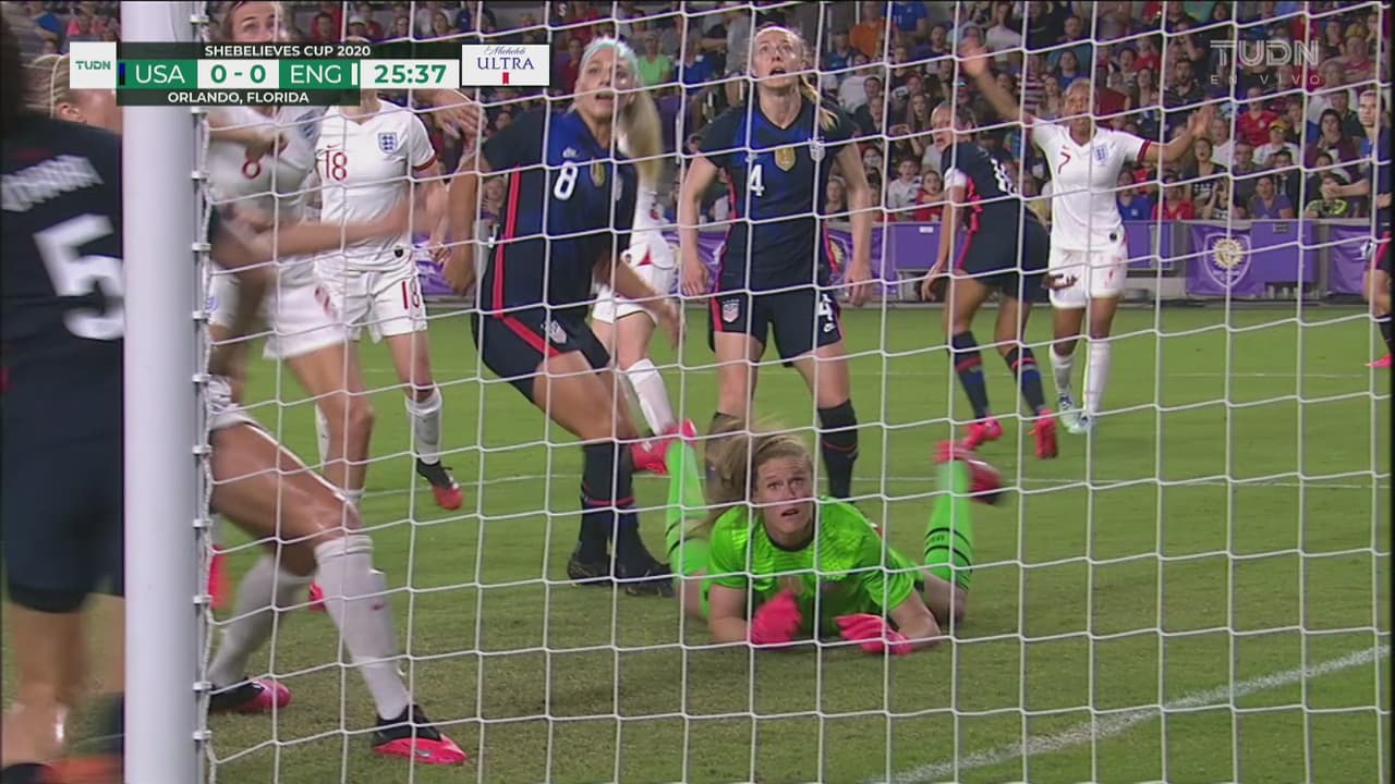 La centrocampista de Inglaterra estuvo a punto de abrir el marcador, pero a la hora de enviar el balón al fondo de la red fue incomodada por la portera.