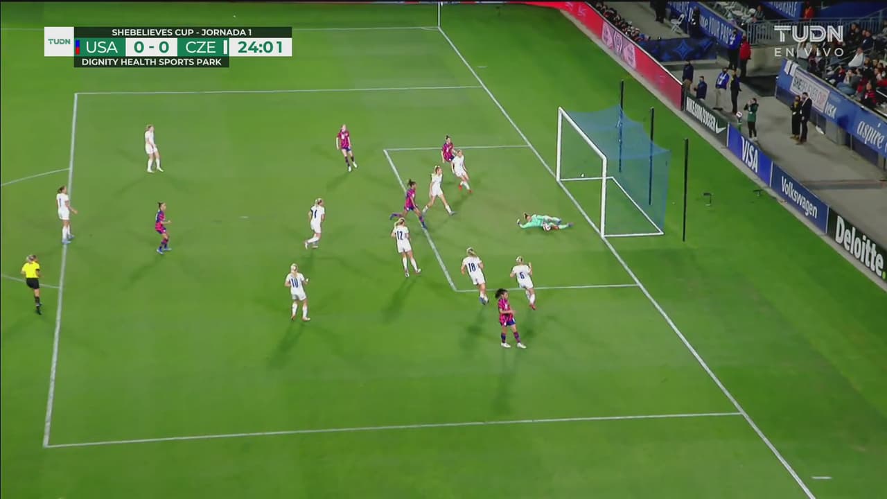 La atacante de Estados Unidos dejó en el camino a dos defensoras, ingresó al área y remató algo débil.