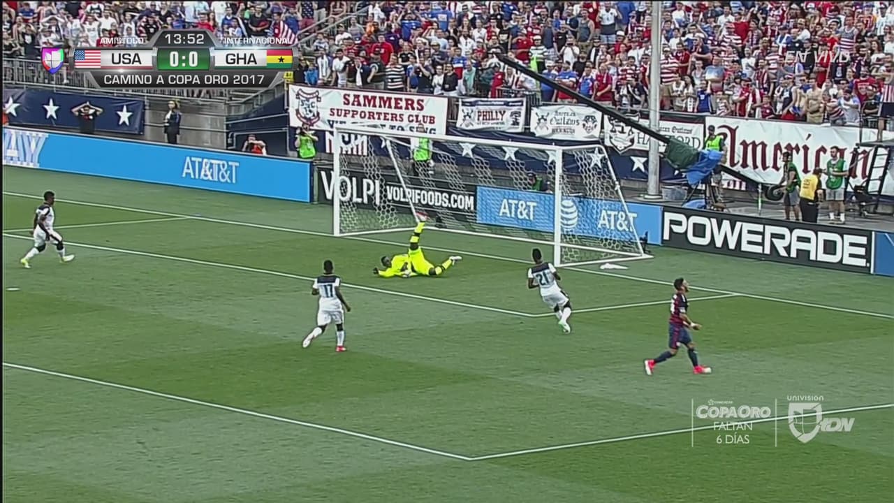 La tercera jugada en la que estuvo inmiscuido el centro delantero de Estados Unidos fue gracias a una terrible entrada que recibió por parte del arquero Ofori que no fue catalogada increíblemente por el árbitro central como tarjeta roja.