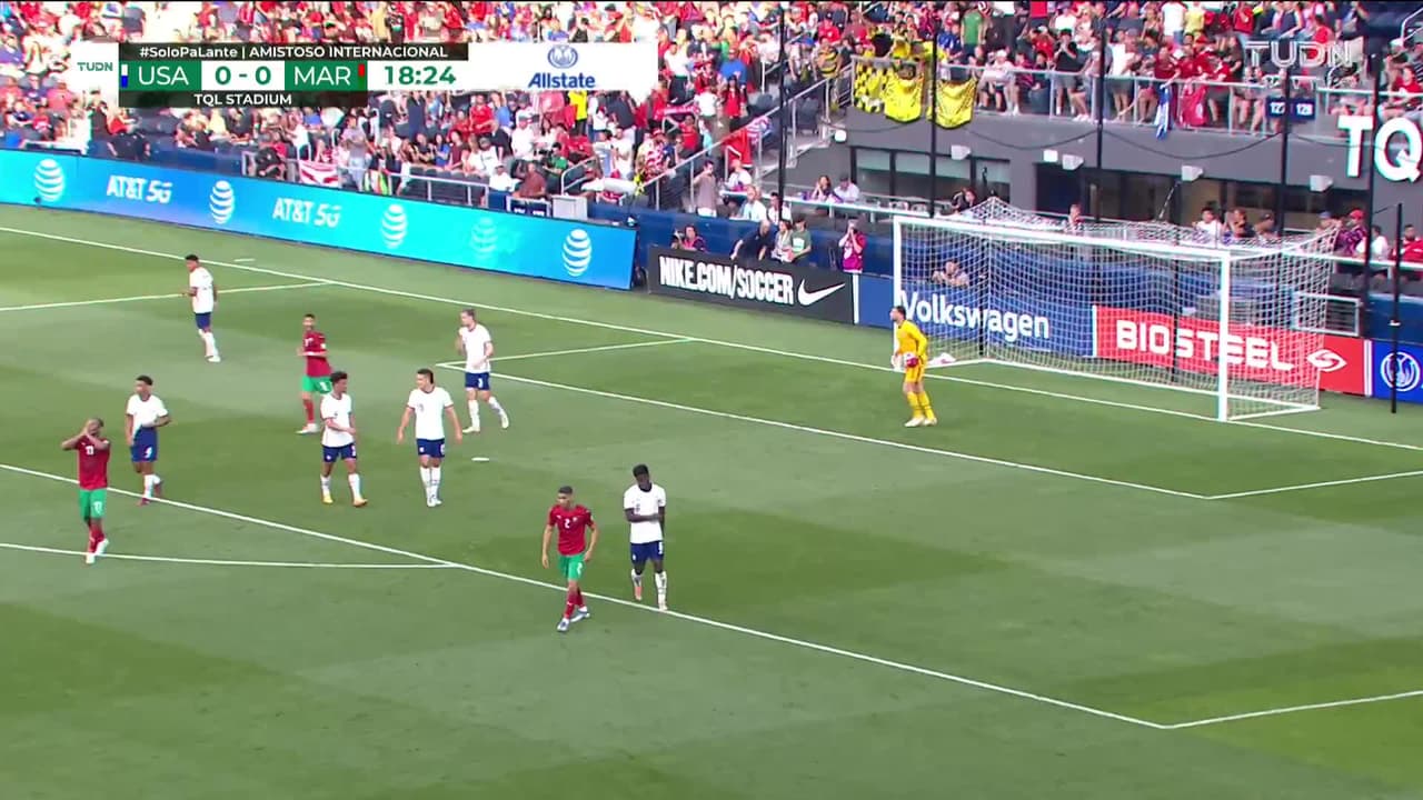 Tiro atajado. Ayoub El Kaabi (Marruecos) zurdazo desde fuera del área.