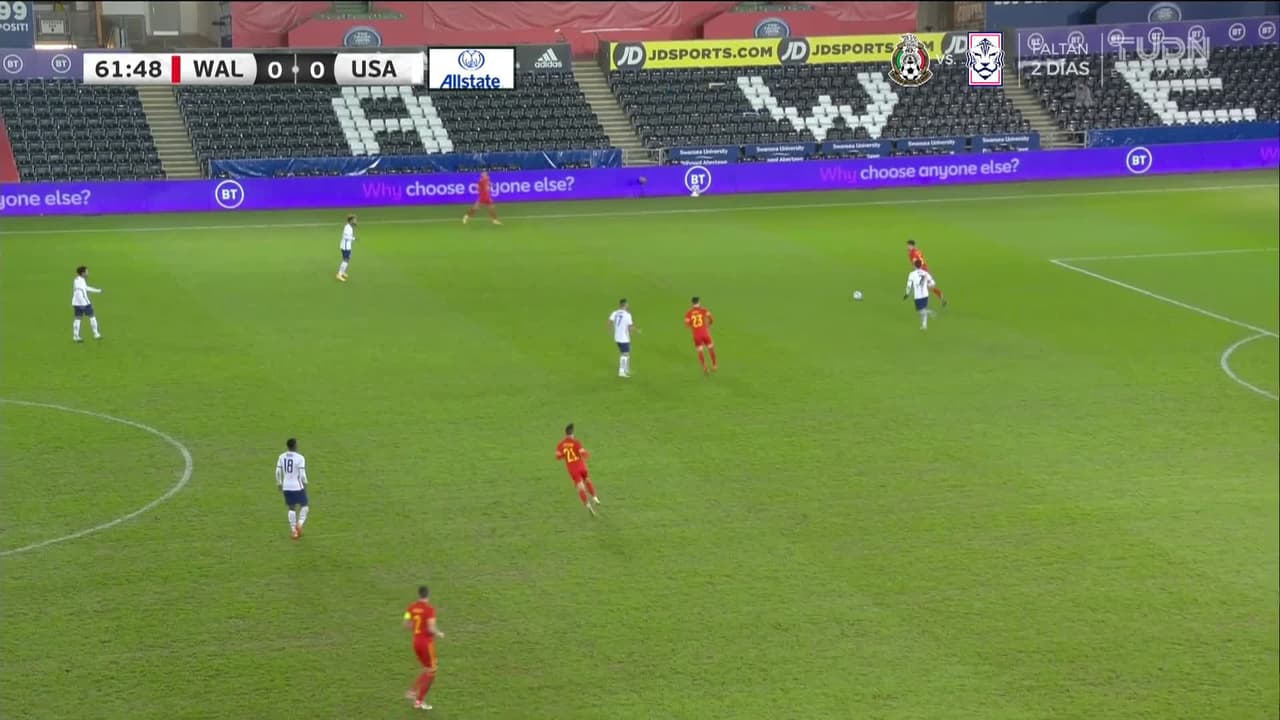 Tiro atajado raso al centro del arco. Brennan Johnson (Gales) Disparo con la derecha desde el lado derecho dentro del área. Asistencia de Tom Lawrence.