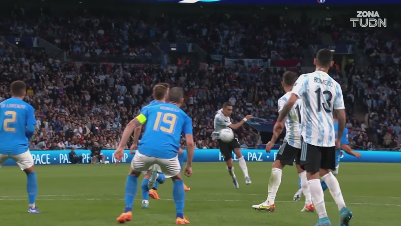 Lionel cobró retrasado desde el córner, Ángel llegó para prender el balón de aire desde las afueras del área.
