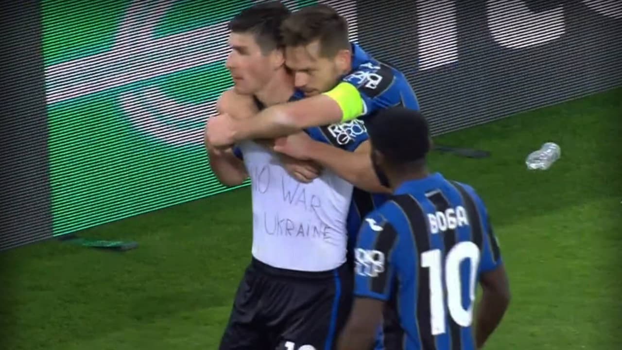 Cuando llegó la tercera anotación del Atalanta, el jugador con la playera 18, se levantó la parte frontal para descubrir un texto que escribió en una camiseta interior donde se podía leer: “No guerra en Ucrania”.