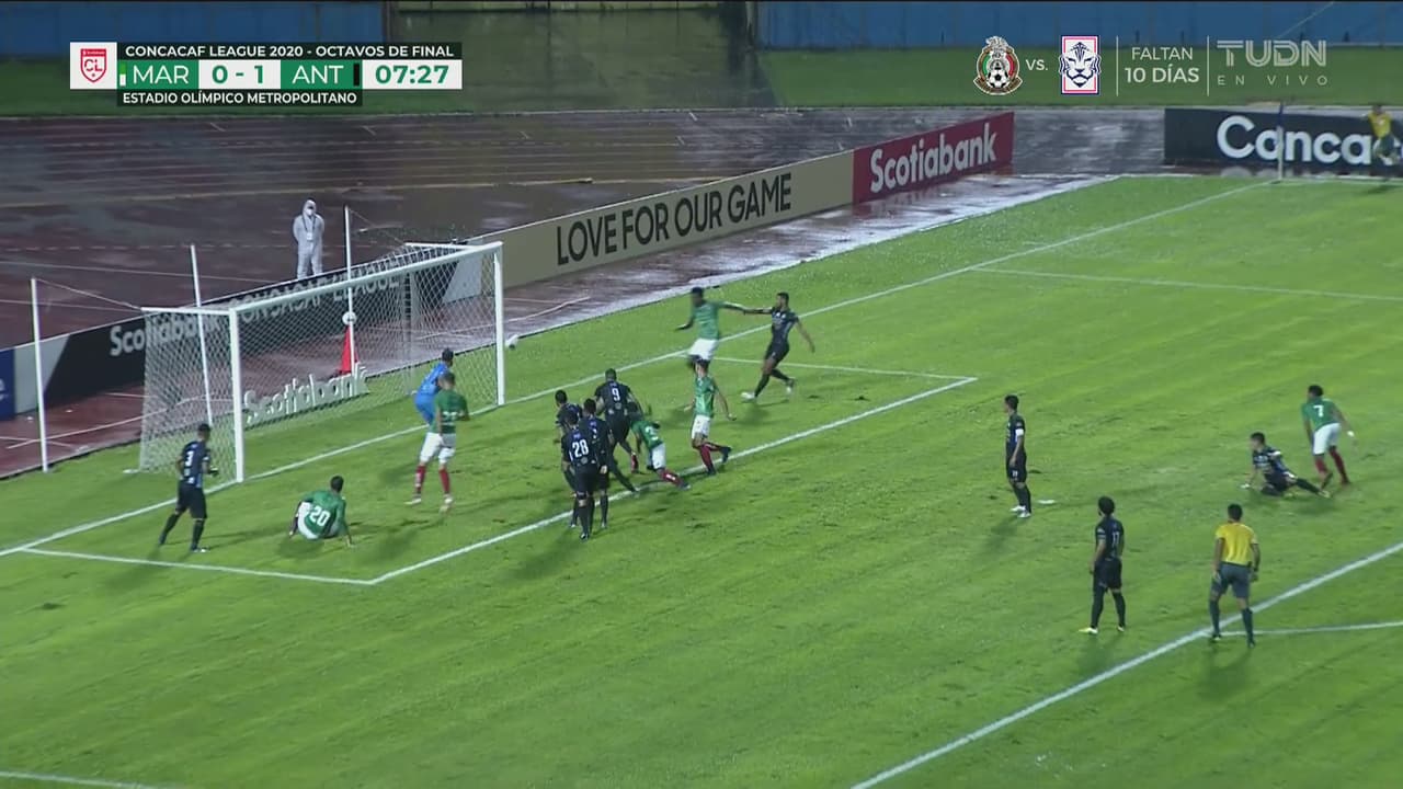 Edwin Solano le gana por el aire a la defensa contraria, cabecea y ve su balón estrellarse en el vertical, al 8’.