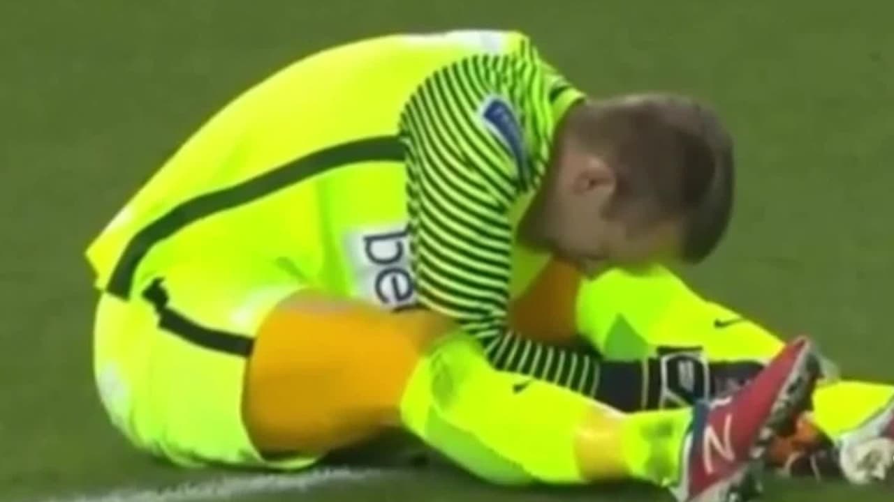 El arquero del Genk recibió la pelota y salió disparado para sacar un contraataque. Le pegó de volea pero el pie de apoyo, el izquierdo, se le dobló de manera impresionante.
