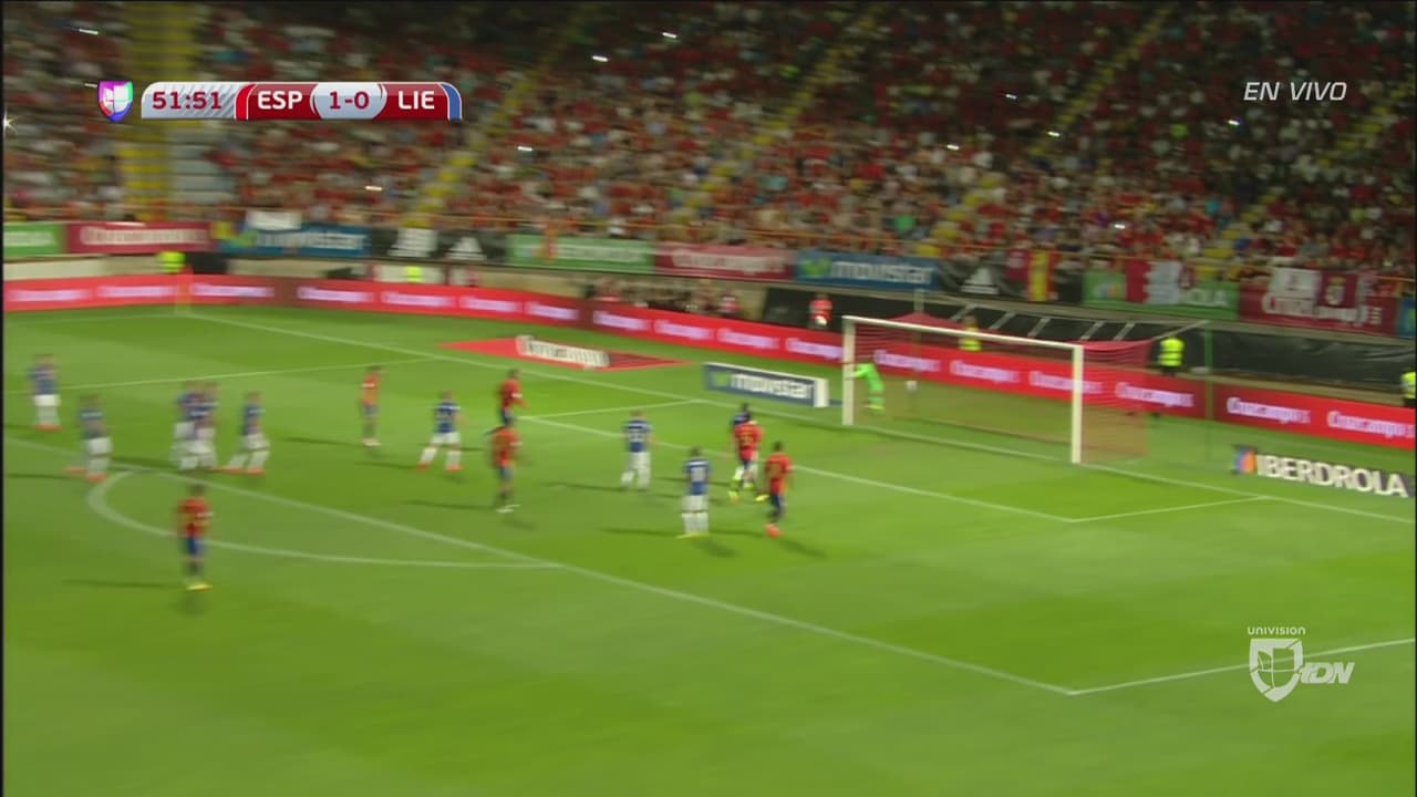 El mediocampsta español cobra un tiro libre que pega en el poste y sale en dirección al campo de juego para buena suerte del Liechtenstein.