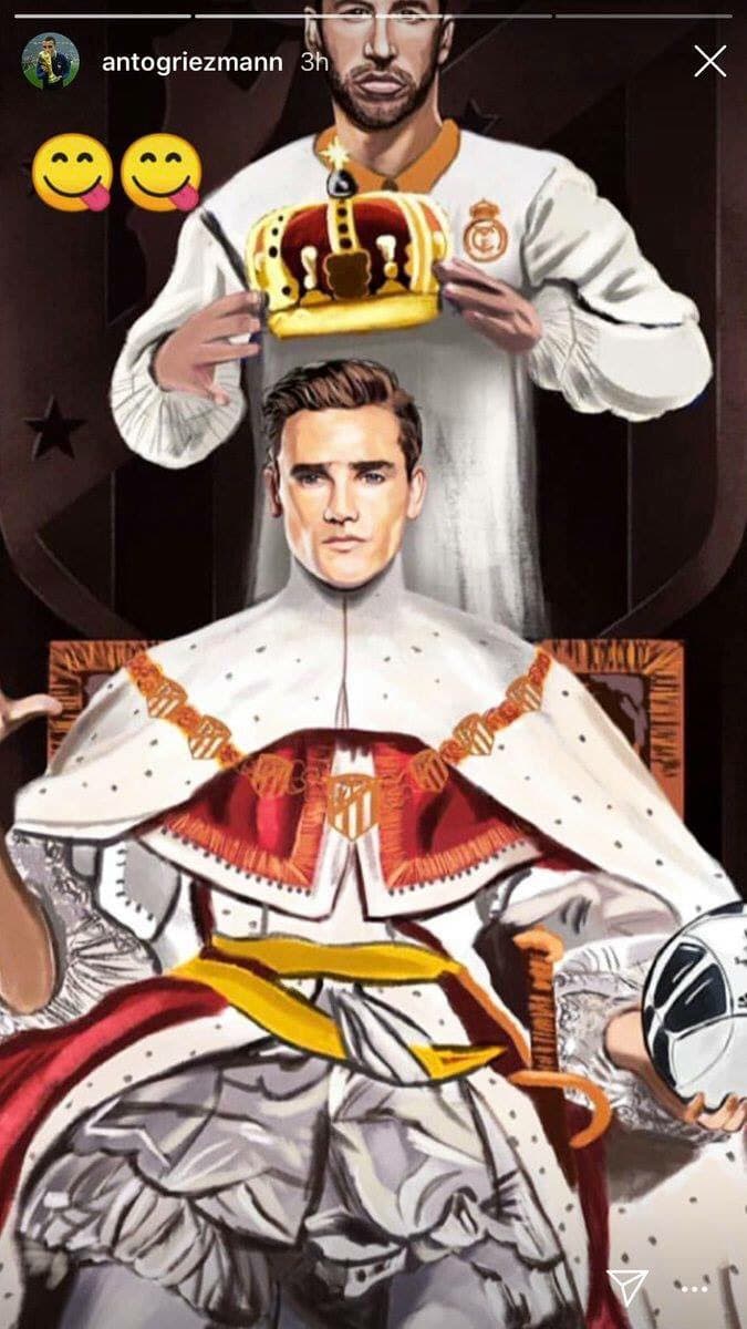 El atacante francés compartió una fotografía la cual 'caricaturiza' el cambio de trono, al menos en el Europa, tras la victoria del Atlético en Estonia. En la imagen aparece Griezmann sentado en el trono y tras él, Sergio Ramos poniéndole la corona de rey.