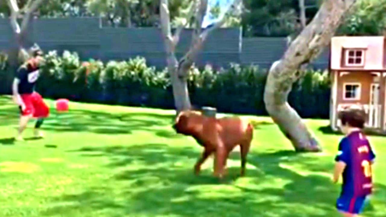En medio de sus vacaciones, el astro argentino del Barcelona juega al 'torito' con sus dos hijos. Los tres evitan que su perro agarre la pelota.