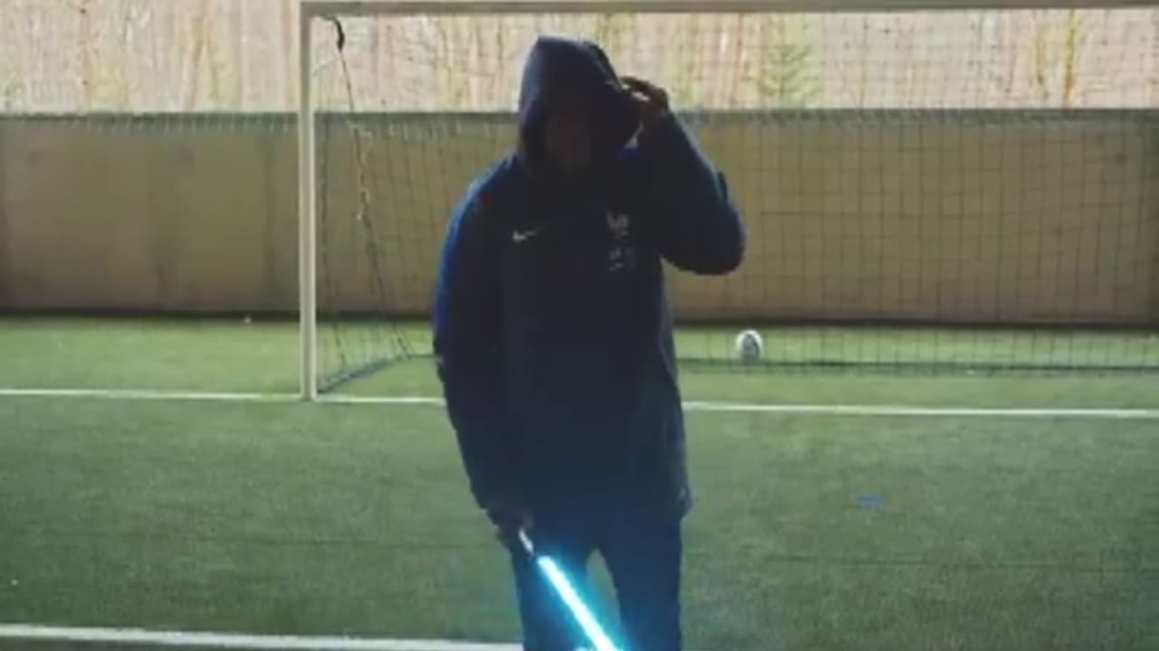 El jugador francés del Barcelona hizo este truco, en el cual rompe en dos una pelota con su espada laser que le lanzan por el aire.