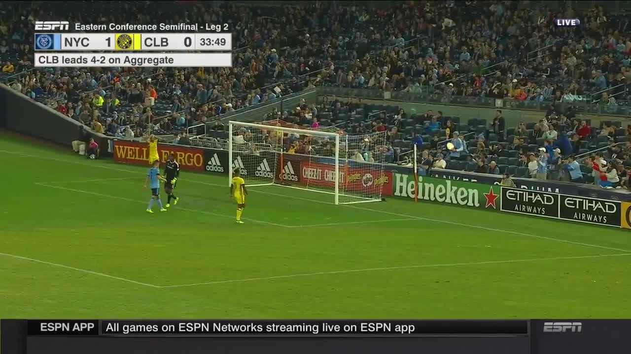 El portero del New York City FC, se luce con una volada impresionante para detener un remate espectacular del mediocampista del ‘Crew’, y así, mantener el 1-0 a favor de su equipo.