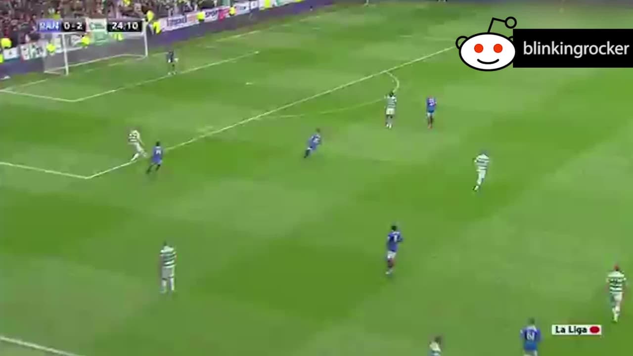 El croata Jozo Simunovic realzió esta brutal barrida sobre Kenny Miller del Rangers, en el partido que su equipo el Celtic ganó por 5-1.