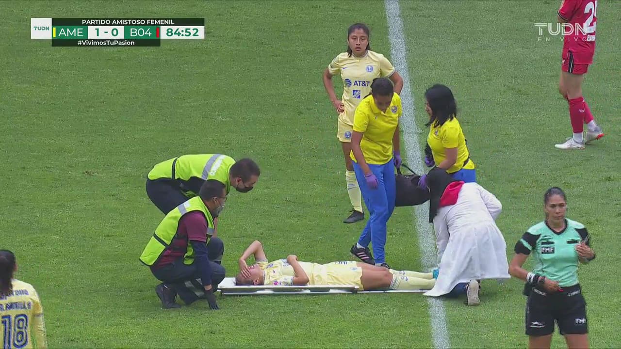 La jugadora del América se lesiona y tiene que salir ante el Bayer Leverkusen, al minuto 85'.