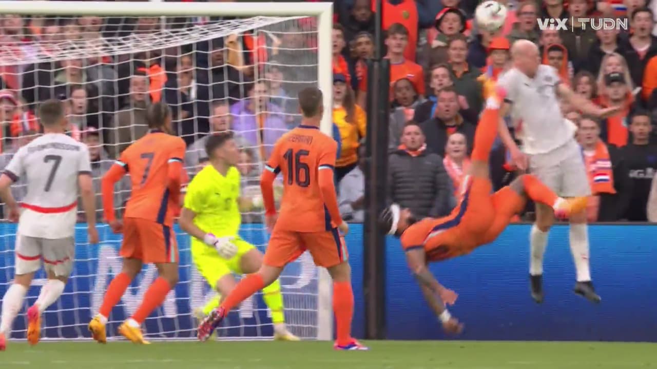 El atacante de Holanda coqueteó con una gran anotación luego de un rebote del arquero, pero falló al rematar.