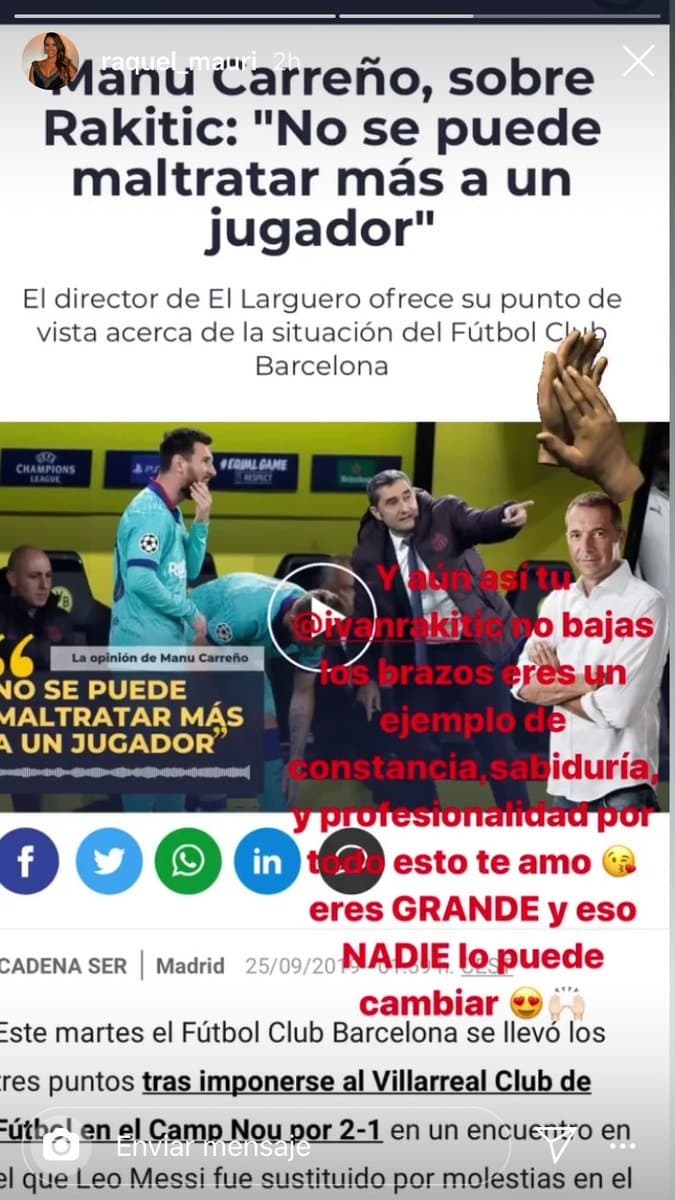 Raquel Mauri compartió unas palabras de Manu Carreño, periodista de la Cadena SER, quien dijo los siguiente sobre la situación actual de Rakitic: "No se puede maltratar más al jugador".