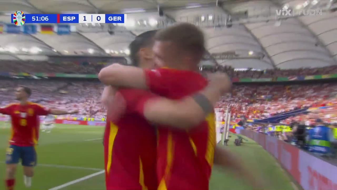 Lamine Yamal tiró un centro a ras de pasto por derecha para Olmo quien casi desde la media luna sacó un tiro colocado, imposible para Manuel Neuer y hacer estallar a la afición por primera vez en Stuttgart.
