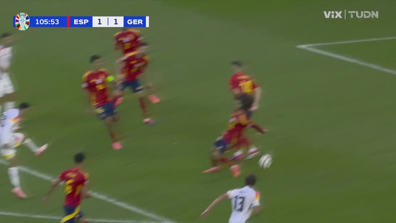 Morata, Williams y Lamine se encargaron de inquietar a la zaga alemana, pero el primer golpe recibido por los ibéricos vino por una fuerte falta de Toni Kroos, quien derribó de forma imprudente a Pedri. El elemento del Barcelona se fue lesionado del encuentro a final de cuentas.