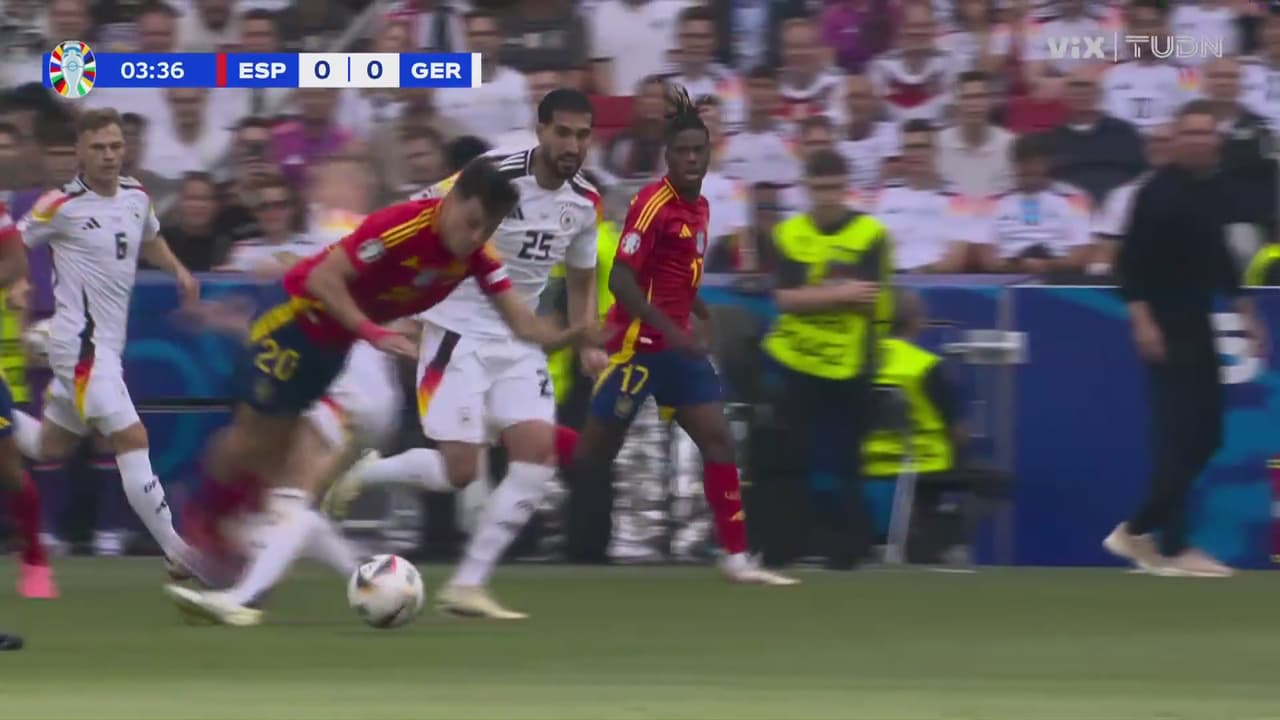 En un inicio intenso de partido, en el que ya Marc Cucurella aquejó la agresividad germana, Pedri se llevó la peor parte con una dura entrada de Kroos en el minuto 4 en la que se dobló su rodilla izquierda y que, tras unos minutos en el campo intentando reincorporarse al ritmo, le impidió continuar.