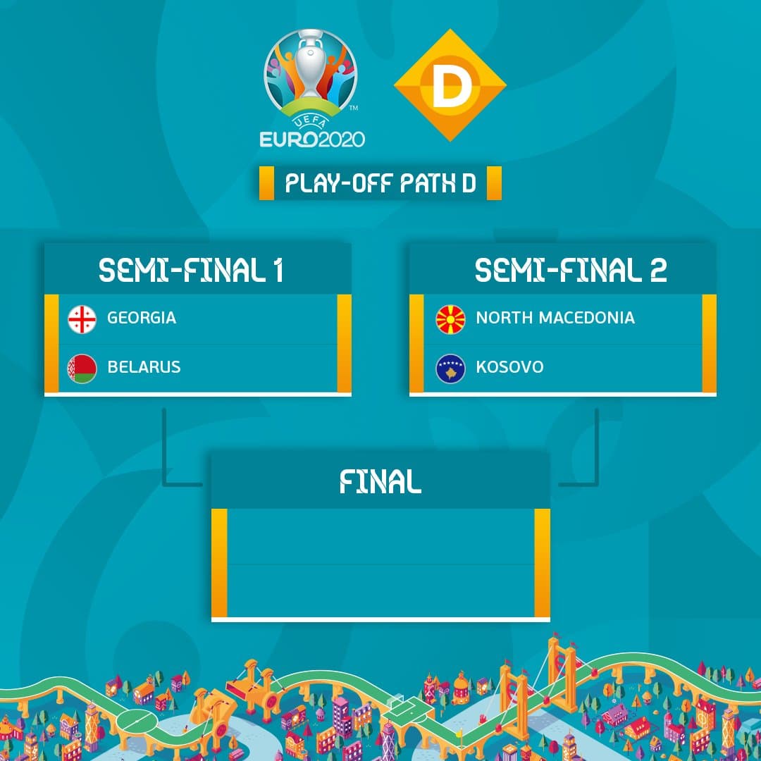 Finalmente, en la Liga D se encuentran cuatro países que jamás han disputado una Eurocopa. Georgia-Bielorrusia (Tbilisi, 26 de marzo) y Macedonia del Norte-Kosovo (Skopje, 26 de marzo) serán los choques de semifinales y la final se jugará el 31 de marzo y hará de anfitrión el vencedor entre georgianos y bielorrusos.