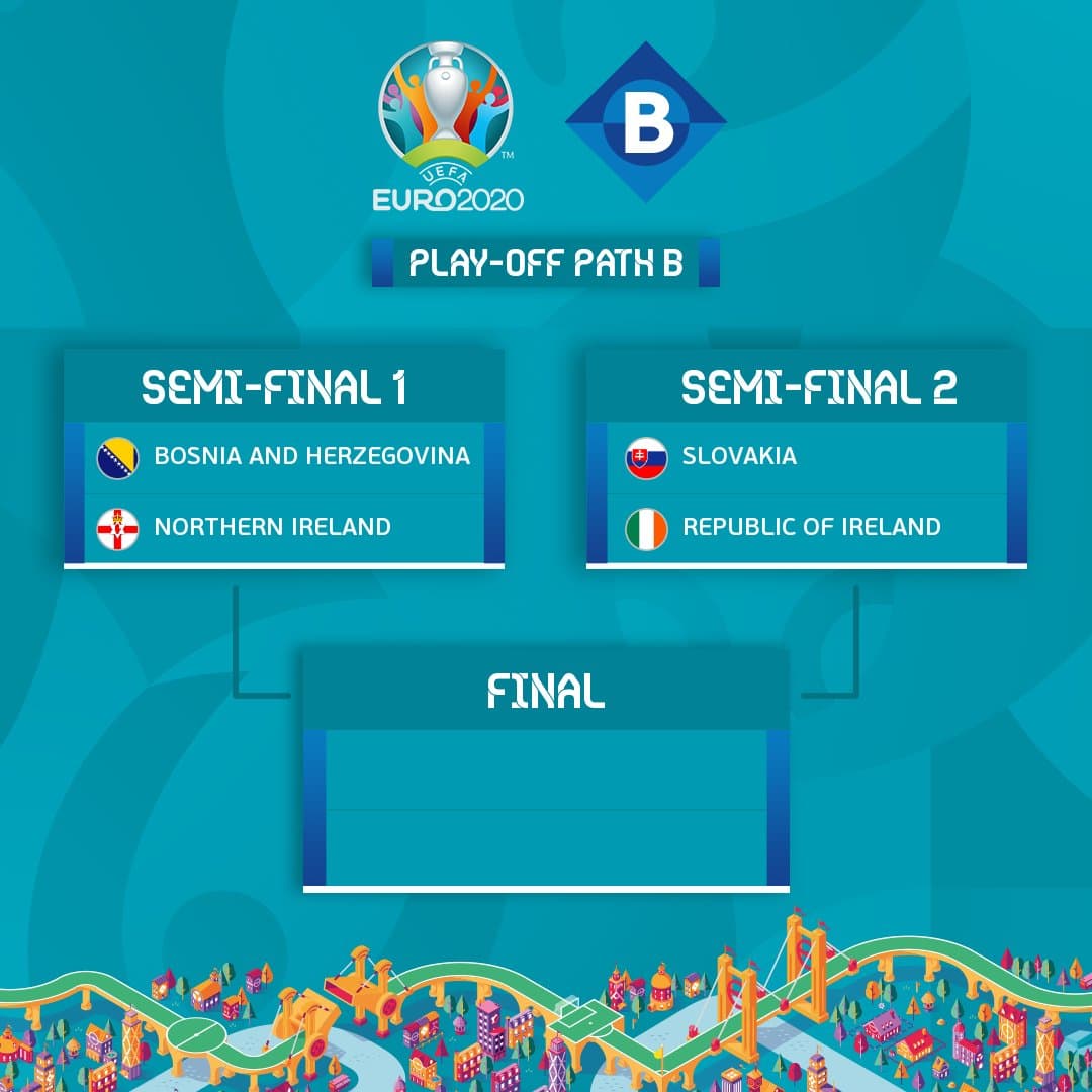 En la Liga B las semifinales involucran a las dos Irlandas, que podrían enfrentarse en la final. Bosnia-Herzegovina reibirá a Irlanda del Norte el 26 de marzo en Zenica y Eslovaquia hará lo propio ante la República de Irlanda en Trnava. La final se jugará en suelo bosnio o norirlandés.
