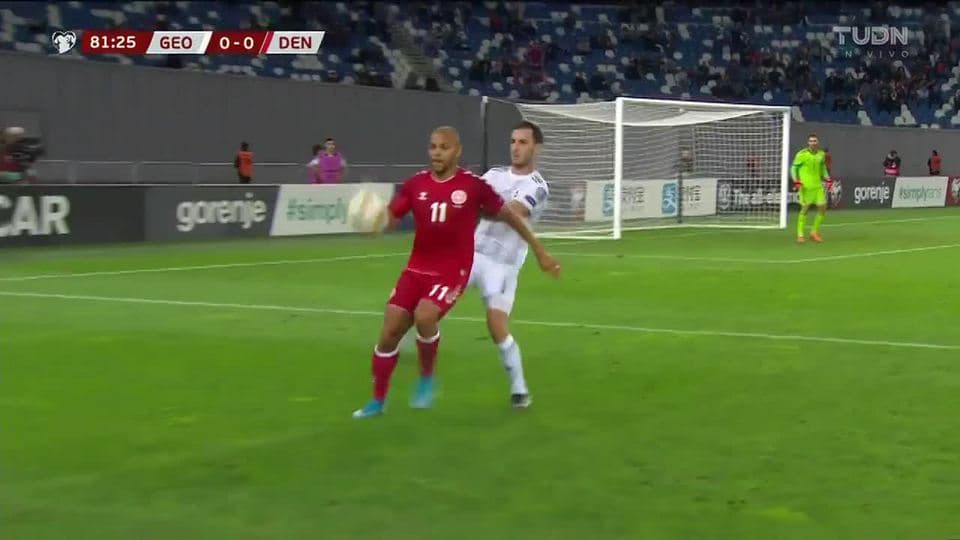 ¡CERCA!. Christian Gytkjær disparó que se estrella en el poste. on September 8, 2019