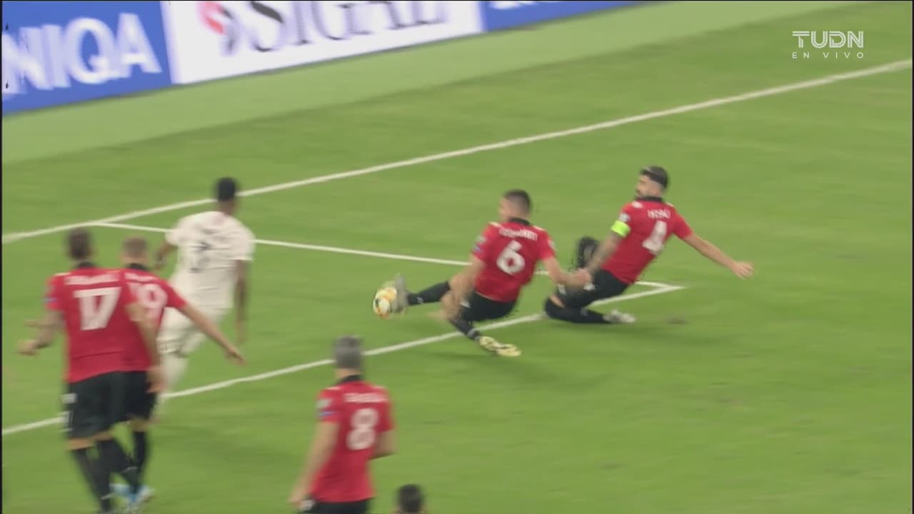 Ni Hysaj ni Djimsiti logran conectar el remate en el área chica y el balón termina saliendo por la línea de fondo del arco de Mandanda.