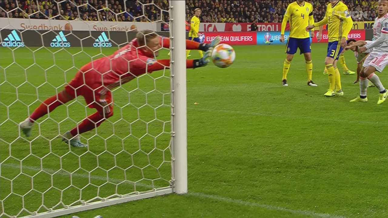 Servicio por derecha para el centro-delantero de España, quien se antepuso a las torres suecas para rematar de cabeza, pero el arquero mandó a un lado al 19’.